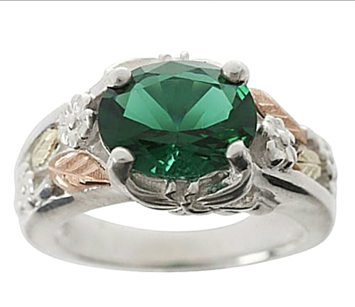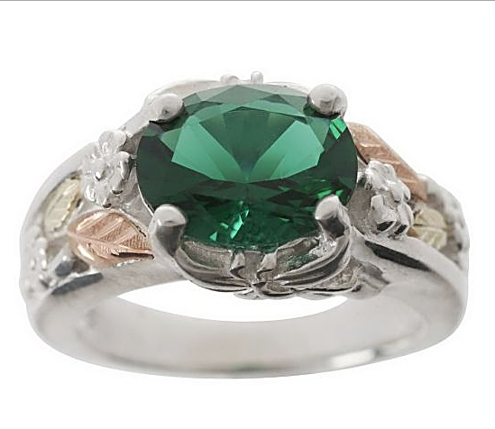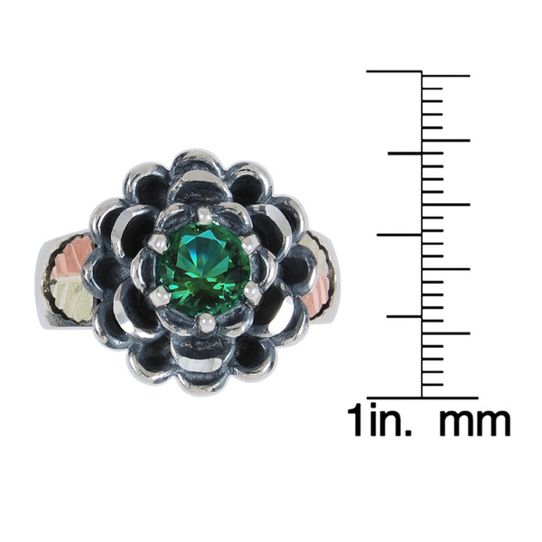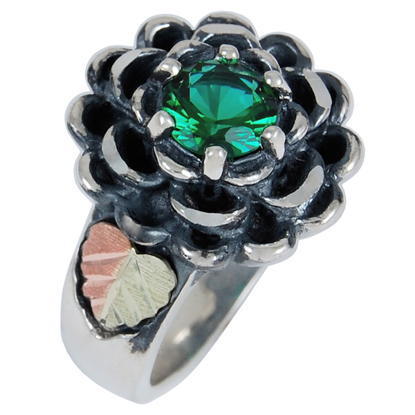 Tagged 12k Green Gold, 12k Rose Gold, Black Hills Gold jewelry, Black Hills Gold Motif rings, Emerald Obsidianite Oxidized Flower Ring, Flower ring