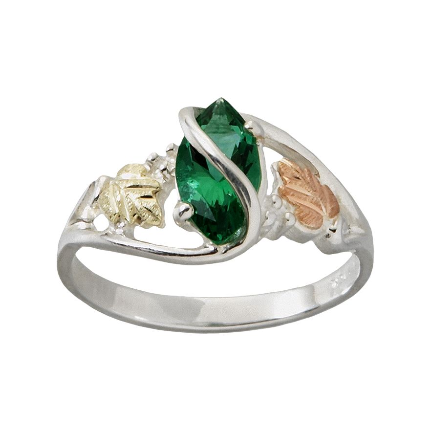 Beautiful Black Hills Gold and Mount St. Helen’s make a great team; the creation? This beautiful sterling silver ring featuring a bright Marquise-shaped Emerald Obsidianite with a 12k rose gold leaf and 12k green gold leaf framing the Marquise. This ring contains no nickel; it’s gentle on sensitive skin. Upon ordering, the jewelers in South Dakota start crafting your ring immediately. From the casting to the hand-placed and hand-engraved leaves, it is one of the most labor intensive styles of jewelry today.