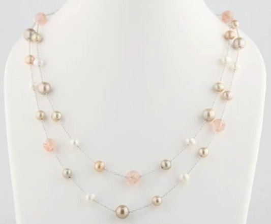 Freshwater Cultured Pearl and Mica Station Necklace with 48 multi color pearls and 8 mica beads.