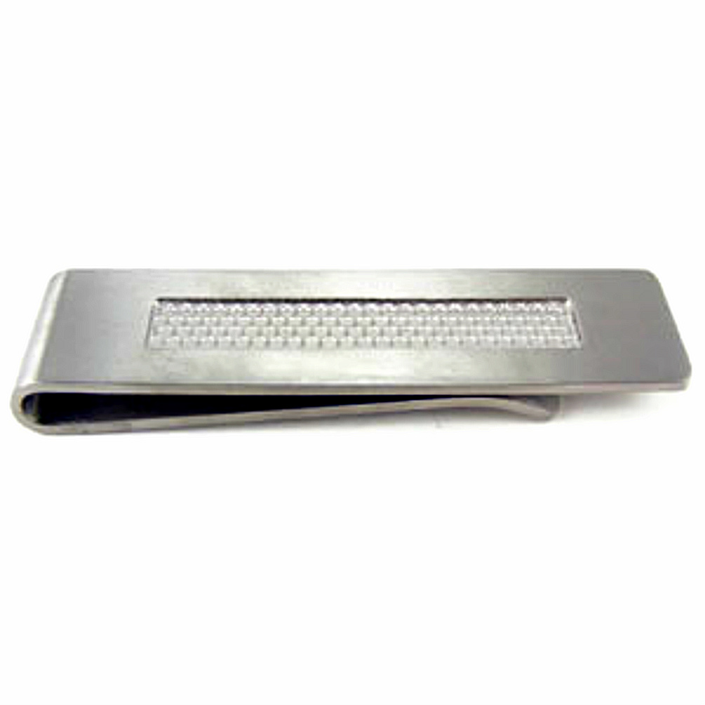 Elegant titanium money clip with a rectangle window of shimmering grey carbon fiber. The sleek money clip is a fantastic accessory, it works well with suits and casual wear.